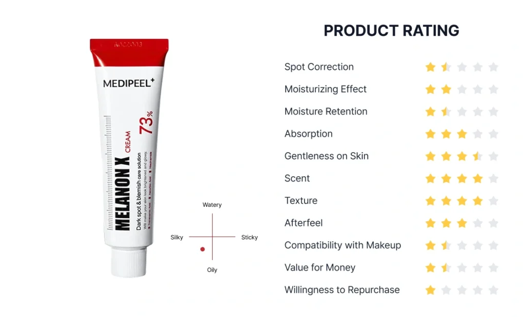 The Medipeel Melanon X Cream is appealing because its texture is much better than other dark spot and blemish creams on the market; it feels like a regular skincare product and causes minimal irritation. The container is small (30ml), but this seems intentional to prevent ingredient oxidation and degradation, so the capacity isn’t a major complaint.
